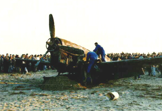 Lt. Michael Mauritz P-40 aircraft number X-39 engine overheated to 150 degrees centigrade. Lt. Michael Maruitz says he was not shot down however aircraft had previous damage but was still air worthy. Aircraft was forced down due to overheating engine failure and fuel tank was dropped as a safety measure before aircraft made a successful dead stick belly landing in the shallow water near the beach.